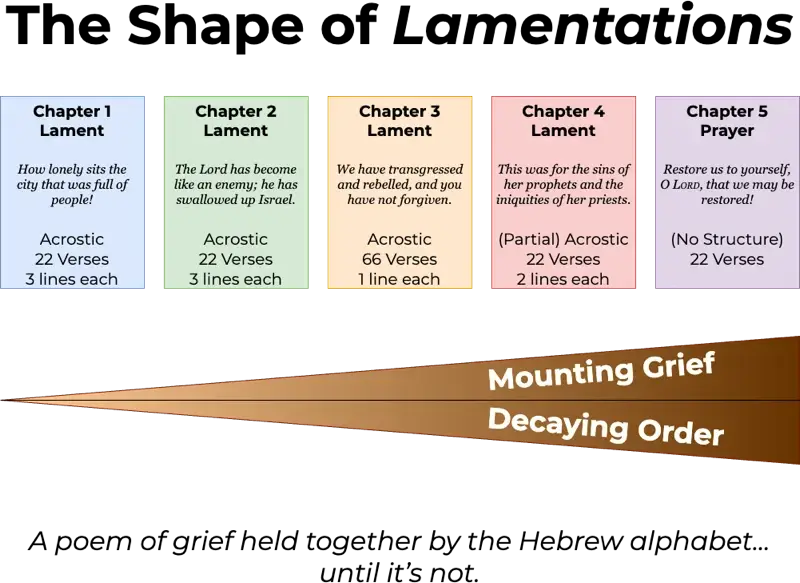 This is not just poetry; it is theology in design. “He has walled me about so that I cannot escape… my soul is bereft of peace” (Lamentations 3:7, 17). The unraveling structure mirrors the unraveling soul. When even the alphabet fails, the grief is complete.